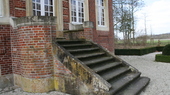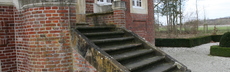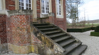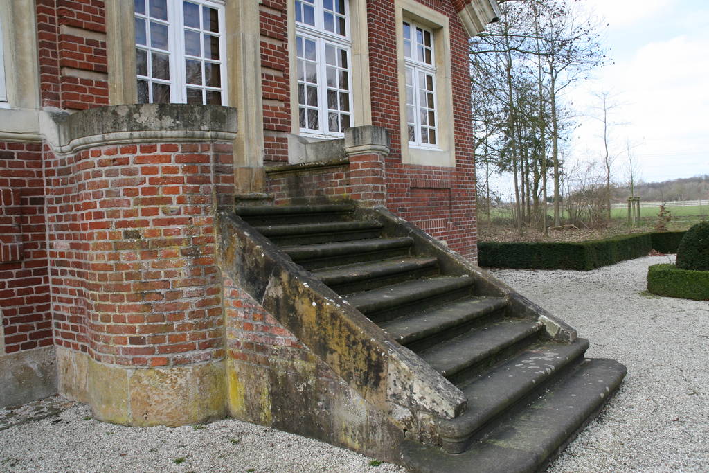 Treppe zum Gartensaal mit den beiden Steinbänken am oberen Ende, die Annette die "Harfe" nennt..