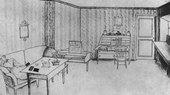 Es gibt eine Zeichnung des Raums, die von Annette selbst stammen soll. Darauf ruht sie, erschöpft wirkend, auf ihrem Kanapee, ein Buch in der Hand. Auf dem Tisch sehen wir eine Handarbeit, einen Korb mit Obst, weitere Bücher - und in der Mitte, ins Zentrum gerückt, stehen Tintenfass und Schreibfeder bereit.