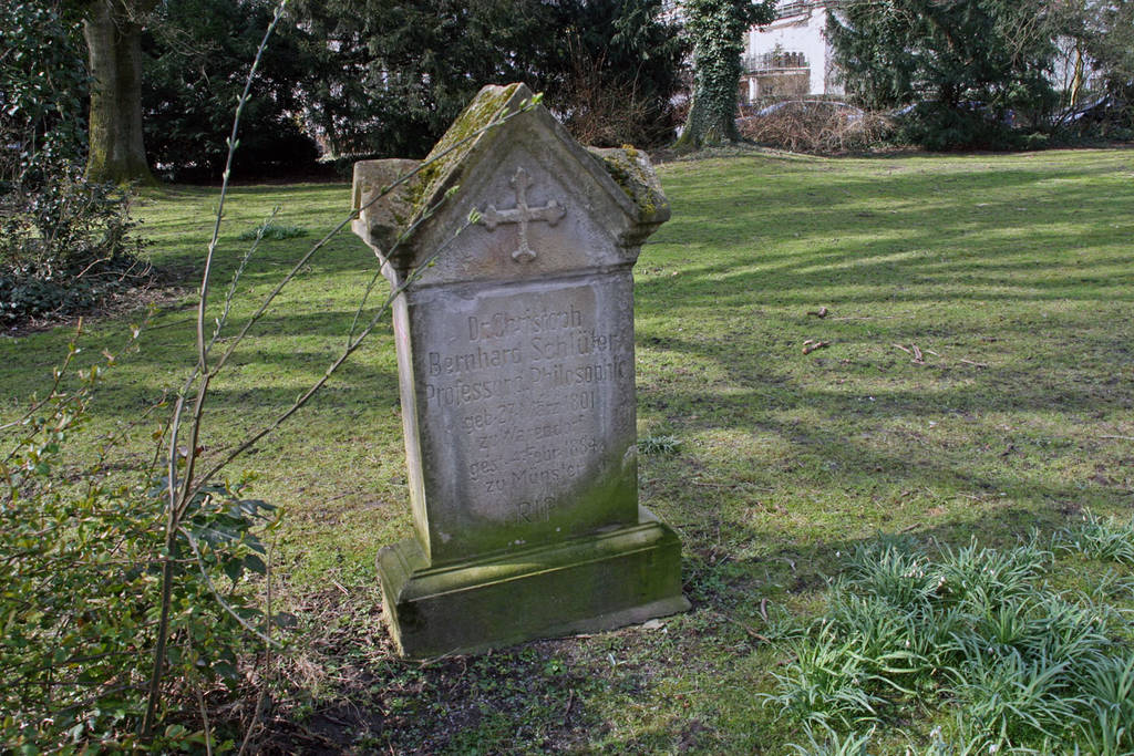 Die Freundinnen schauen in Münster auch bei Christoph Bernhard Schlüter vorbei, der zunächst am Alten Fischmarkt, später am Steinweg wohnt. Heute erinnert ein Grabstein auf dem Hörster Friedhof an den blinden Professor.